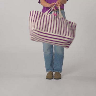 Gestreept, paars en ecruOnze praktische, ruime en stijlvolle boodschappentas van biologisch katoen is ontworpen om u van 's ochtends tot 's avonds te vergezellen. Hij biedt voldoende ruimte om al uw dagelijkse accessoires mee te nemen, maar blijft toch licht en comfortabel om te dragen.